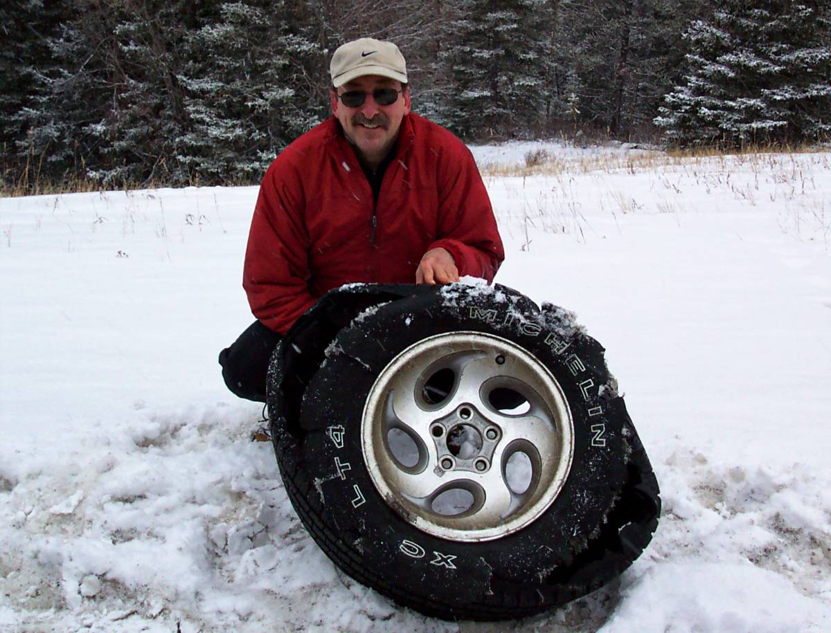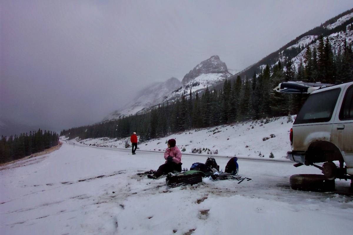 This was by far the quickest I ever did Chester Lake - back home by 2PM. Oh... wait a minute, maybe that's because I didn't do Chester Lake today. Instead, we (Ed, Ed, Stephanie and I) blew a tire (completely shredded it, in fact) just north of the winter gate. The jack was no good, and our cellphones were out of service, so while Ed and Ed managed to take the old tire off, and Stephanie flagged down cars hoping to catch the rest of our group on their way out (never did find them... blast! They must have all been ahead of us), I hitched a ride with Karen (from scrapbooking who says 'hi' to Carole) and her two friends to the Peter Lougheed Info Center where I called AMA for help. Vern from AMA was great, in spite of my total lack of knowledge about exactly what kind of help we needed (I wasn't sure if we actually needed help changing the tire or if we needed a tow somewhere, which caused all kinds of problems with figuring out what Vern should put into our call), and Dennis from Standish Towing was also great and sent someone out right away to help us. Leaving the info center, I hitched a ride right away with Jerry the snow plough driver who gave me a lift all the way back to the highway. It was really nice out today, so I wasn't worried about the walk back, but it was nice to have a ride in the snow plough! At the highway, Jerry dropped me off and I started walking, but I'd only gone about 100m when a nice RCMP dude stopped and drove me the rest of the way. I even got to sit in the front seat of the cruiser! Reunited with my carpool mates, we hung out on the side of the road rather than in the truck because it was so nice out, and Stephanie, Ed#4 and I did a bit of snow shoeing around where we waited, while Ed#1 kept watch. About an hour and a half after I made the call, the AMA guy showed up and using his heavy-duty jack, had the tire changed out in no time. We headed on back to Calgary, and as soon as I had cell service again I called everyone on the trip and left messages about what happened to us. Hopefully they didn't wait too long and had a lovely day without us. -- Rhonda |