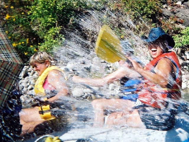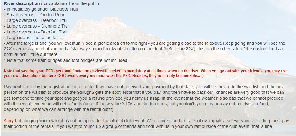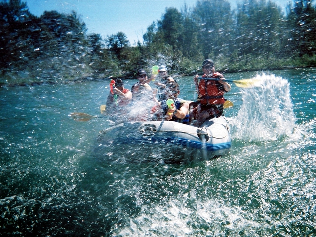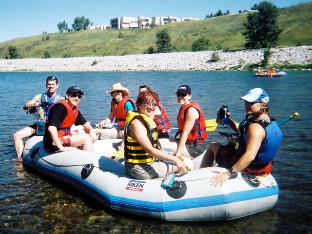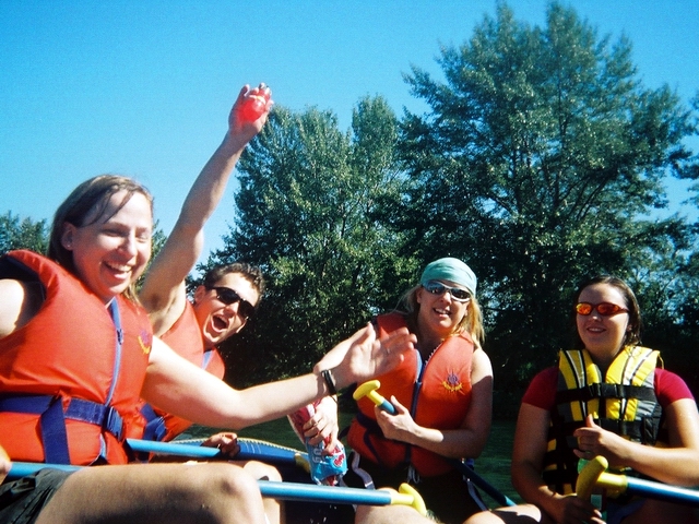 Niagara, Mushroom and Chip upped the stakes by introducing "amphibious warfare". These are close combat attacks carried out from the water. Niagara (aka captain/ dictator / slave driver) was almost mutinied until she earned her crew's respect by assaulting an enemy raft from the water. Stuart's (aka first officer) naval career was off to a rocky start as we found him huddled in the fetal position after the first bombing. But once he pulled himself together and learned to use his paddle he was a worthy mate. Jordan (aka science officer) and his sister, Cesia, were a formidable team of paddlers, keeping our raft straight and true, while dishing out some water power to enemy rafts. Matthew (aka weapons officer) also had great paddle control while keeping the boat afloat by pumping out the water intaked during battles. Anika and Rachel, both brilliant tactical and linguistics officers aslo proved worthy mates. Perhaps our raft should have been named "the bird of prey"...? Between the 7 of us we had lived in about 10 countries and spoke about 15 languages. This still didn't help diplomatic relations with other rafts though. When food was low, we tried bartering with the locals for food or fish, but to no avail... the fisherman were not having a good day. Exhausted and soaking, we made our way to the picnic area where a truce was called between all rafts, and food and stories were shared for ages to come... well, I left after 30 minutes. -- Niagara (from "Kon Tiki") Top notch! It was a great crew. Here are my "lessons of the river" for the trip: "Paddles and bailers will always outgun a super soaker!" "Always make sure your sunscreen is waterproof (ouch!)" "Always be wary when someone calls a truce in a waterfight." - Dave (from "The Good Ship, Lollipop") We had a great time! The Green Nuts were especially good! Thanks to Mark for some great manoeuvring of the raft and attacks made on other rafts! We got everyone wet...except one raft that escaped our paths! Next year, we'll get you! Arghhh! - Mushroom (from "Captains Bligh and the Bounty") I am, indeed, a tactical genius. Not that I'm good for anything but choosing good people for my team, most notably Lisa Marie as captain and Chip as tactical officer. Of course, everyone pitched in, and I still took many a full-face of water, but compared to being completely unarmed and defenseless in the "Chicklet" raft last summer, I felt that I was ruling the river this time around! Two rafters discovered just how long ten minutes could be when they decided they HAD to pee SOON, and were assured (several times) that the take-out was JUST ten minutes away. Finally, to their relief, we pulled the raft over to the bank for them to take care of business at a spot which was, ironically, about ten minutes away from the take-out. I'm glad that Gen will never be known as "the girl who peed in her shorts". Not like Hoodoo's raft - I'll always remember that they took turns peeing in the river. I'll never swim in the Bow again, or splash anyone - promise. - Lisa Marie L and Pudge (from "The Ruthlessly Recalcitrant Rhondas") I want to thank all of you who organized this event! I can honestly say I would never have attempted anything like this, but felt comfortable trying it with such a large group. It was a great way to see this river that I have lived by most of my life. I will definitely come equipped with water ammunition next time; our raft (the dodo birds) was the inexperienced and wet bunch! Thanks COC! - Colleen (from "Dancing Dodo") Right from the beginning, Hoodoo and her Blowfish knew they'd be in trouble. They were the largest group - 8 rafters total - so they ended up in the biggest raft, and were thus the biggest target. Hoodoo knew well in advance that Pudge would be her nemesis for the day, though Chip talked a good game too (interestingly, neither of them were particularly frightening once we hit the water). In a mid-river water war, Hoodoo and the Blowfish lost a paddle and a bucket to The Ruthlessly Recalcitrant Rhondas, but neither boat came out a true victor in that battle. The rest of the float was peaceful for Hoodoo and her Blowfish (we paddled along fine, despite being down a paddle) - no one bothered to declare war on them again, and when they came up on the Dancing Dodo, a truce was declared so that the Dodo could borrow one of the remaining buckets to bail their wet craft. While Hoodoo knows for sure that she didn't pee in the river, she can't be so sure about the rest of her crew. Cindy led the plunge into the frigid waters, deciding to swim alongside the raft for a while when it got too hot. Darryl soon followed, and Heather, Susan, Patrick and Hoodoo all made the plunge a time or two to escape the relentless heat. Everyone got practice in hauling overboard rafters back aboard the craft - some just couldn't resist floating along until their limbs threatened to go numb! All in all, it was a fantastic day. A great time was had by Hoodoo and all her Blowfish! - Hoodoo (From Hoodoo and the Blowfish) |