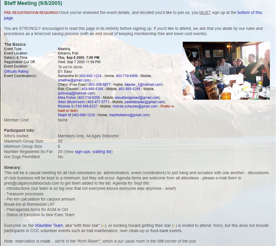 We split into "fast group" and "enjoy the scenery group" at carpool, which worked out remarkably well. I wanted to make sure, since we were hiking in bear country, that I would have at least six people in my "enjoy the scenery group" (when reviewing the list, most of the people I knew looked like "fast group" types). So, we set out with two vehicles for each group. One carpool missed the exit for Lake Louise. Obliviously drove right on past the signs for Yoho National Park... "Welcome to BC", and Lake O'Hara. Not mentioning any names or anything, but I think Frou Frou and Pudge may not be allowed to carpool together anymore. After we'd figured out our error and turned around, Frou Frou decided to go one step further and win the "dumbass remark of the year" award when she said "I wonder how long it would have taken us to figure it out" (gee, I think we just found out exactly how long it would take us....). :> Once the whole gang was assembled at Lake Louise, the fast group set out and left us in their dust. A short ways up the trail we were joined by John and Barb from St. Louis who wanted to join us for "hiking in numbers" sake, but they stayed with us for the "hiking with the Calgary Outdoor Commedians" sake. A fairly unremarkable hike up, with a few nice views to the north on occasion, getting up to the pass itself pays off with the usual "two views for the price of one" bonus... a whole new view to enjoy on the other side of the pass. We saw the "fast group" going up Mt. Fairview, and rumor has it that there was a brief "full moon" display, although it was too high up for any eyewitness confirmation in our group. We joined Ed at the end of the Saddle Pass trail for lunch - he had gone partway up Fairview and then turned around when his knees strongly advised against continuing up. Michael, the "new guy", got his nickname on his first event out - "Kielbasa", and was mostly cool except for the part where he thought we were being too mean to Crackers. I mean, is there really any such thing as being TOO mean to Crackers?? We left the lunch spot as the fast group was beginning their descent from Fairview, and I was surprised that they actually caught up to us by the time we were back at the Lake Louise shoreline. Seven of us enjoyed a trip to the K, where The Colonel and The Stalker amused us all with fascinating "who's the gassiest hiker" competition. -- Rhonda (Pudge) |
