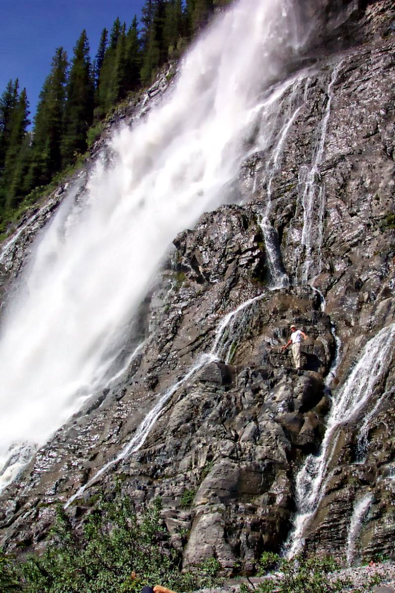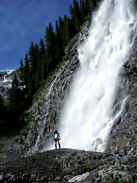 This was a first-ever *real* backpack trip for myself, Marty and Joe. A first in decades for Ed. Not a first of any sort for our seasoned backpackers, Gayle and Tony. We had a FANTASTIC time, brilliant weather (although, at 34C most of the time, a bit on the warm side for me) and a truly amazing location. Kudos to Ed for putting it all together. We set off towards Elk Pass and due to an unfortunate (or fortunate) assumption (hmmmm.... what happens when we assume??) on my part, we missed the turn-off to Elk Lakes and continued on up to the cut line. We obviously made it to Elk Lakes, but we added on about 4.5kms of distance to the trip in. What happened was, just as we arrived at the intersection where we should have turned, someone said something to Marty, to which he replied, very confidently, "That's not it!". I thought the conversation was about the intersection, so, thinking Marty knows the area and was very adamant that that wasn't our intersection, I didn't speak up to say I thought it WAS our intersection. Turned out they were talking about something completely different. Oh well... we all agreed that the mistake was to our good fortune, as we got to see Lower Elk Lake, which was not on our itinerary. We ended up hiking 17kms in to the Petain Falls campground. The maps all show a camp ground at the far end of Upper Elk Lake but that campground has been decommissioned, so if you go to this area, just keep going and follow the "Petain Falls" sign, and then the subsequent "Camping" signs to get to the campground. The campground itself was quite charming, with five tent pads, a separate communal eating and fire area (with bear bins), and a very unstinky open-air "bathroom". Great view, except for any unsuspecting person on their way up before you've finished. I took to hanging my bandana on the "toilet" sign to alert people if I was currently using the "conveniences". From the camp site, you have a great view of Mt. Aosta, which has an amazing collection of "peaklets" all up and down the side of it. Marty renamed it "Mt. Pokey". Ahead of us was a sneak preview of the Petain Glacier and running beside the campground, the first waters of the Elk River. We shared the camp site with a group of four young Nova Scotians on Friday night, and two unfortunate Calgarians looking for a remote romantic get-away (who weren't counting on six COCs cluttering up their retreat), and the resident porcupine which we chased around both nights in search of the perfect prickly photograph. On Saturday we set out on a day hike to Petain Falls, which was absolutely amazing. Then, we set out for Petain Basin, which to hear the four who completed it (thanks to Ed for staying with me after I pooched out in the 34C heat) is a most spectacular and amazing hike. Ed and I are making plans to return to the area to check out that basin at another time. On Saturday evening we had an impressive and very short-lived rain shower that extinguished the very first fire I ever built on my own, five minutes after I made it. Blast!! Oh, well.... I will burn again! On Sunday we had a lovely hike out, missing zero intersections but taking no detours. Good thing, too, 'cuz about 0.5km from the vehicles, Marty blew a big hole in his left toe when his blister just couldn't hold on any longer. -- Rhonda From Marty, regarding the Basin: Petain Creek Waterfalls to Petain Basin (distance 4 km, elevation gain 520 metres). This strenuous hike/easy scramble gives access to either mountaineering opportunities or else a pleasant amble throughout the Petain Basin. There are amazing views of the Castelneau icefall and the top of the Petain Creek waterfalls. This is the most scenic and unique hike I have been on to date and a must do if you are ever in the area!! |