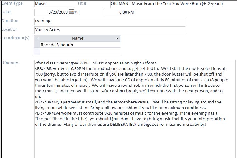 Arrive at 6:30PM for introductions and to get settled in. We'll start the music selections at 7:00 (sorry, but to avoid interruption if you are later than 7:00, the door buzzer will be shut off and you won't be able to get in). We will have one CD of approximately 80 minutes of music ea (8 people times ten minutes of music). We will have a round-robin in which the first person will introduce their music, and then we’ll listen. After a short break, we’ll continue with the next person, and so on. My apartment is small, and the atmosphere casual. We'll be sitting or laying around the living room while we listen. Bring a pillow or cushion if you like for maximum comfiness. Everyone must contribute 8-10 minutes of music for the evening. If the evening has a “theme” (listed in the title), you should (but don’t have to) bring music that fits your interpretation of the theme. Many of our themes are DELIBERATELY ambiguous for maximum creativity! |
