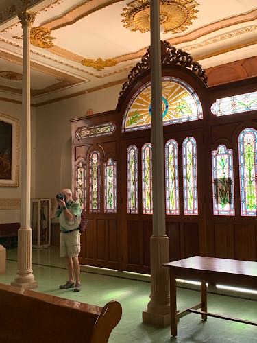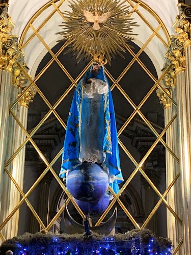 | Tonight we took it easy and walked over to Plaza de Los Fundadores (near our AirBnB). We had a little bit of sushi and watched the people go by. Then we walked back with a quick stop to see the interior of Templo La Cruz for the very first time even though we’ve seen it from the outside zillions of times. It’s kind of ordinary for a Catholic Church but it has a souvenir store in it and a lovely courtyard. Unfortunately by the time we were done looking at the courtyard the souvenir store was closed. Oops. |