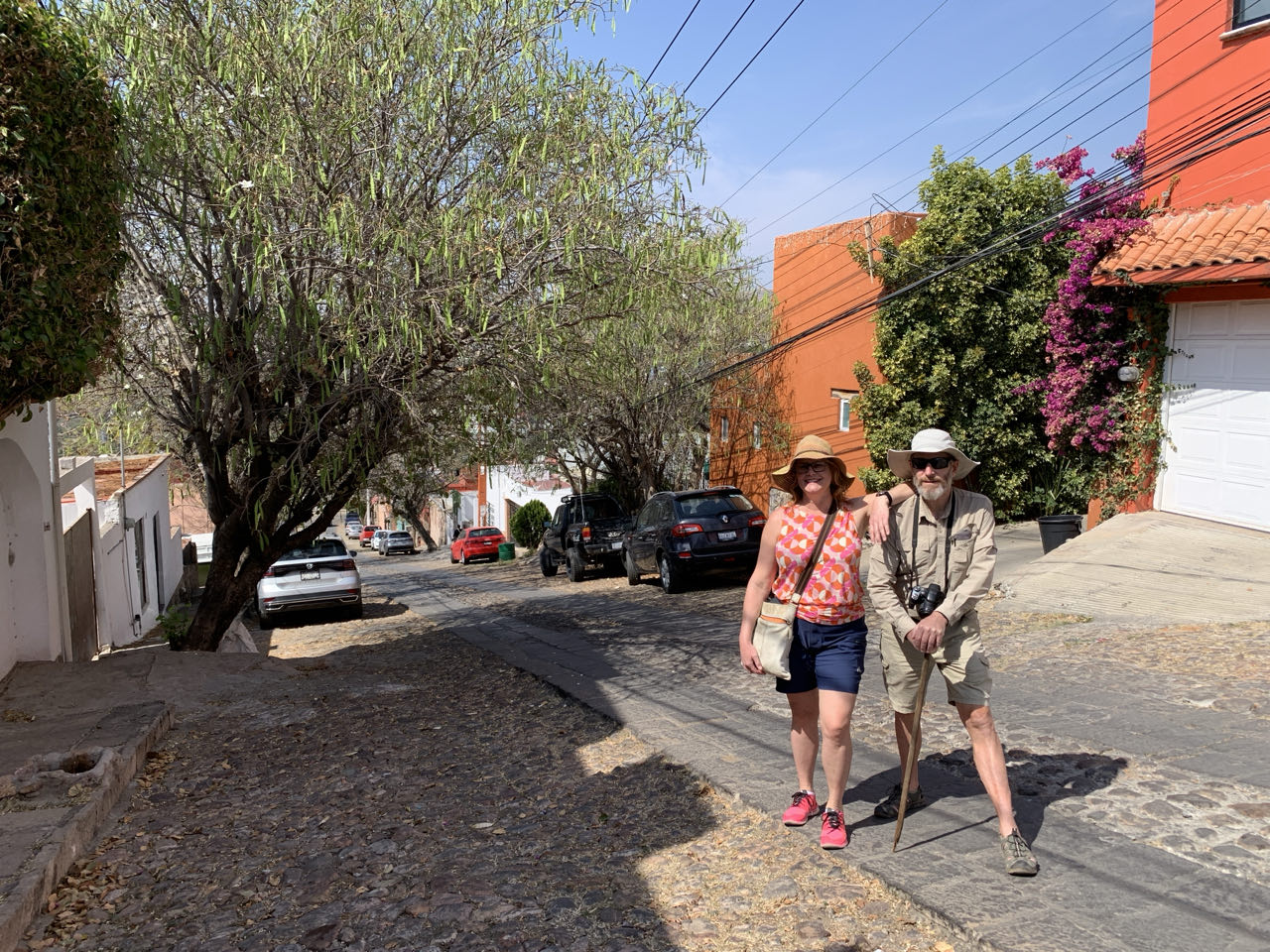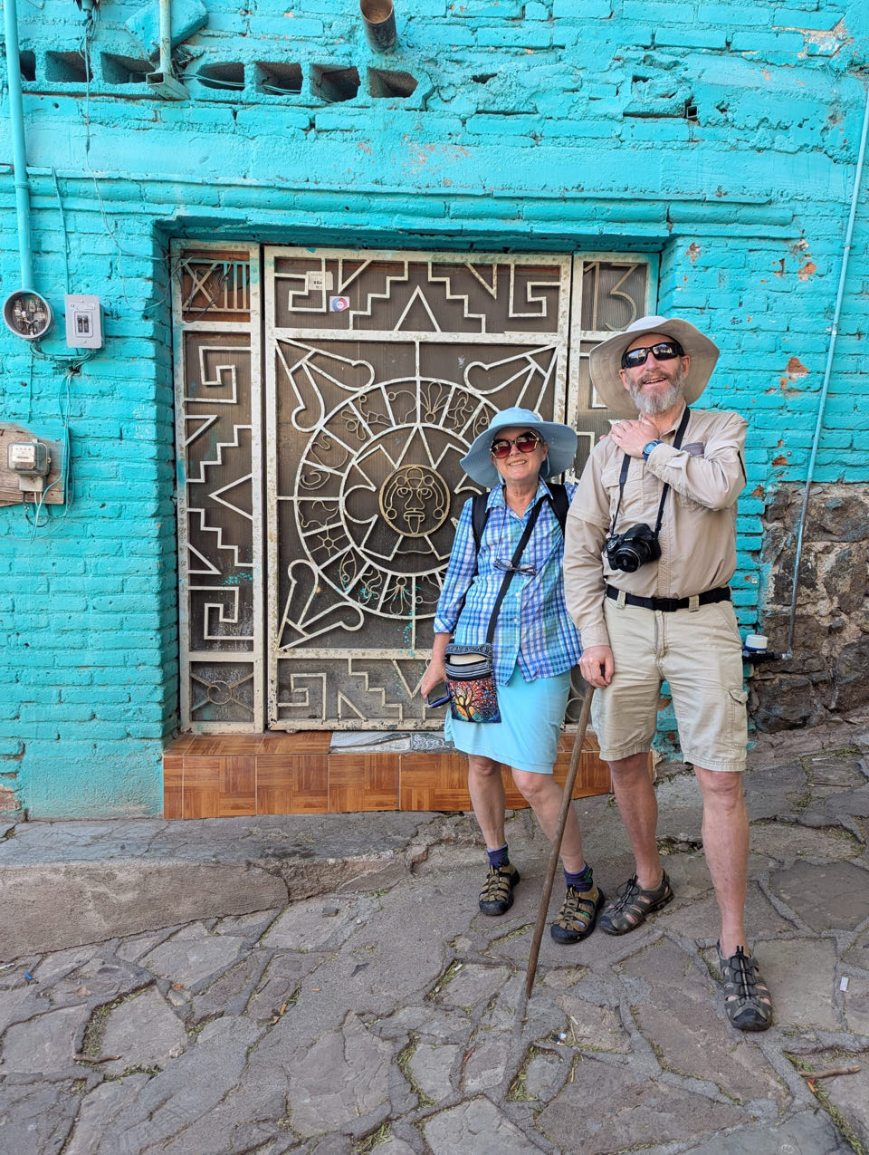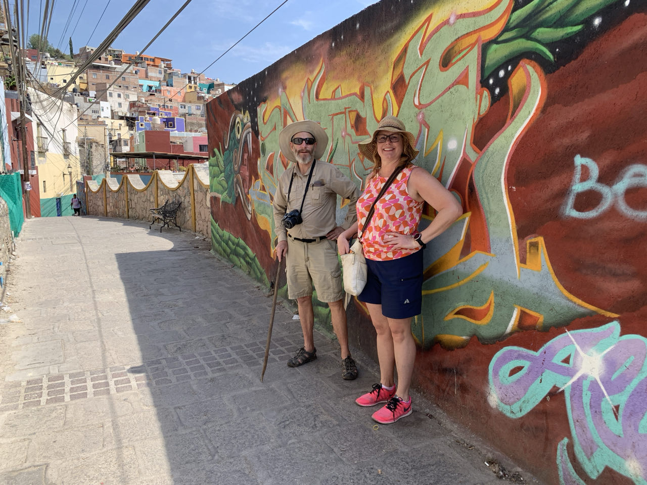 | We went for a walk all over Guanajuato today, including walking up to the monument across the valley from us, visiting five Catholic Churches, and walking up Kiss Alley (Callejon de Beso). A special surprise was getting in a quick visit with Uriel and Ana from Queretaro as they were in town with a client. |