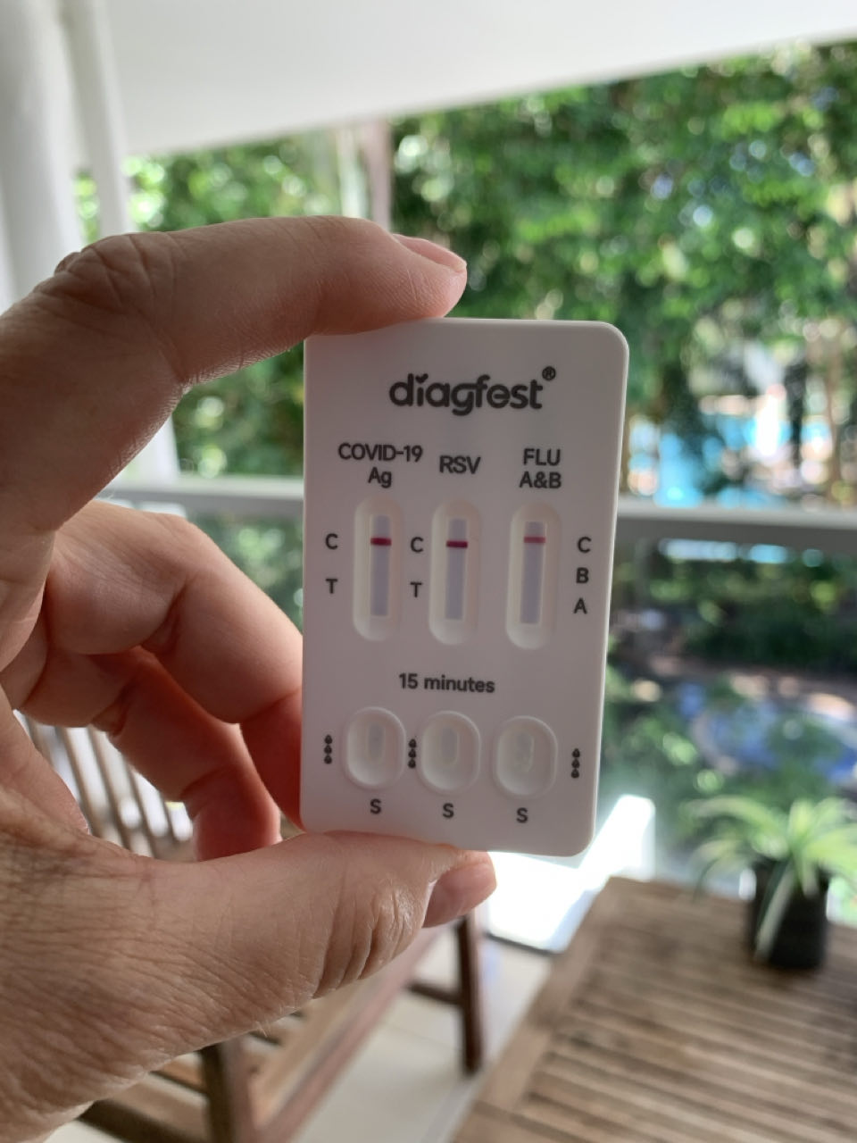 I’ve had a painful (in the lungs) cough for a couple of days now so when Brent went off to the chemist today I asked him to grab me a Covid test. He came back with this nifty little thing that tests for Covid AND RSV AND Flu A and B.