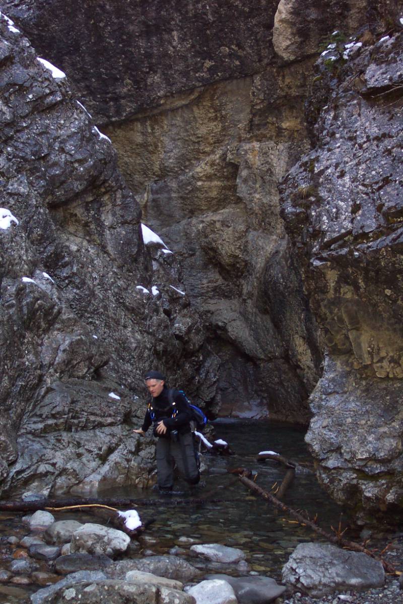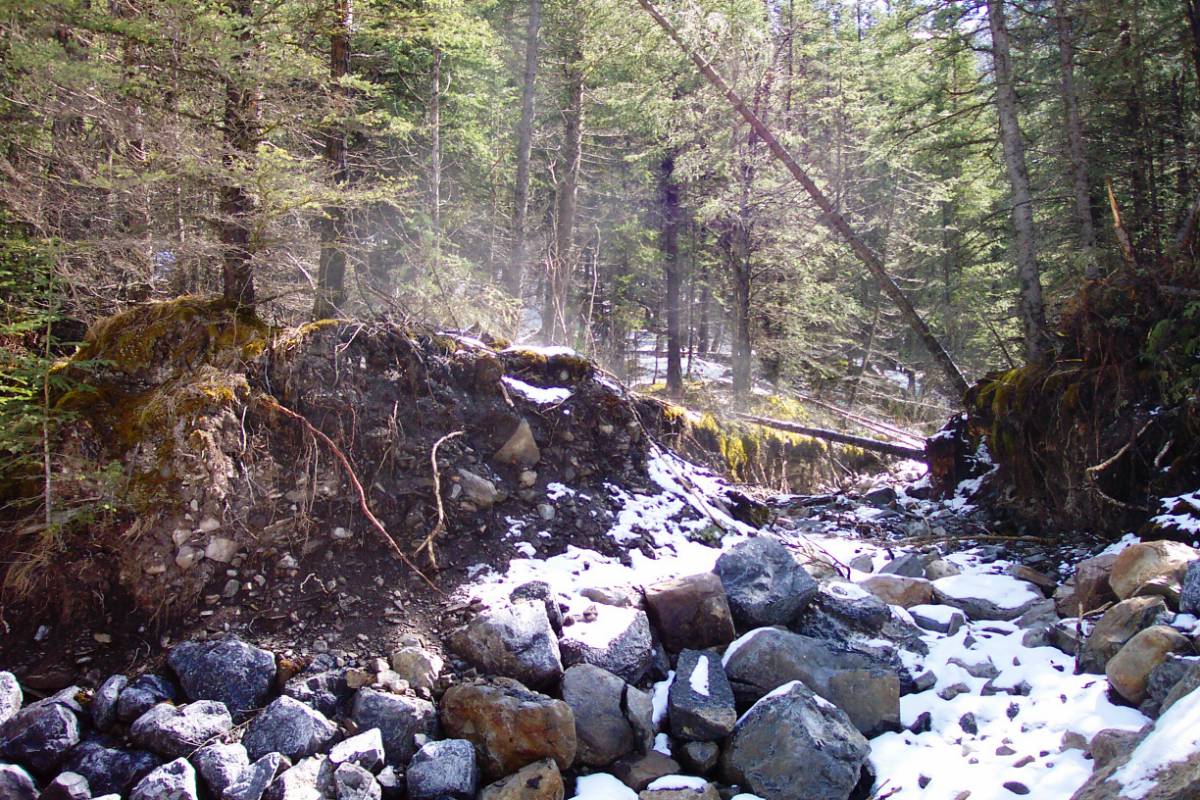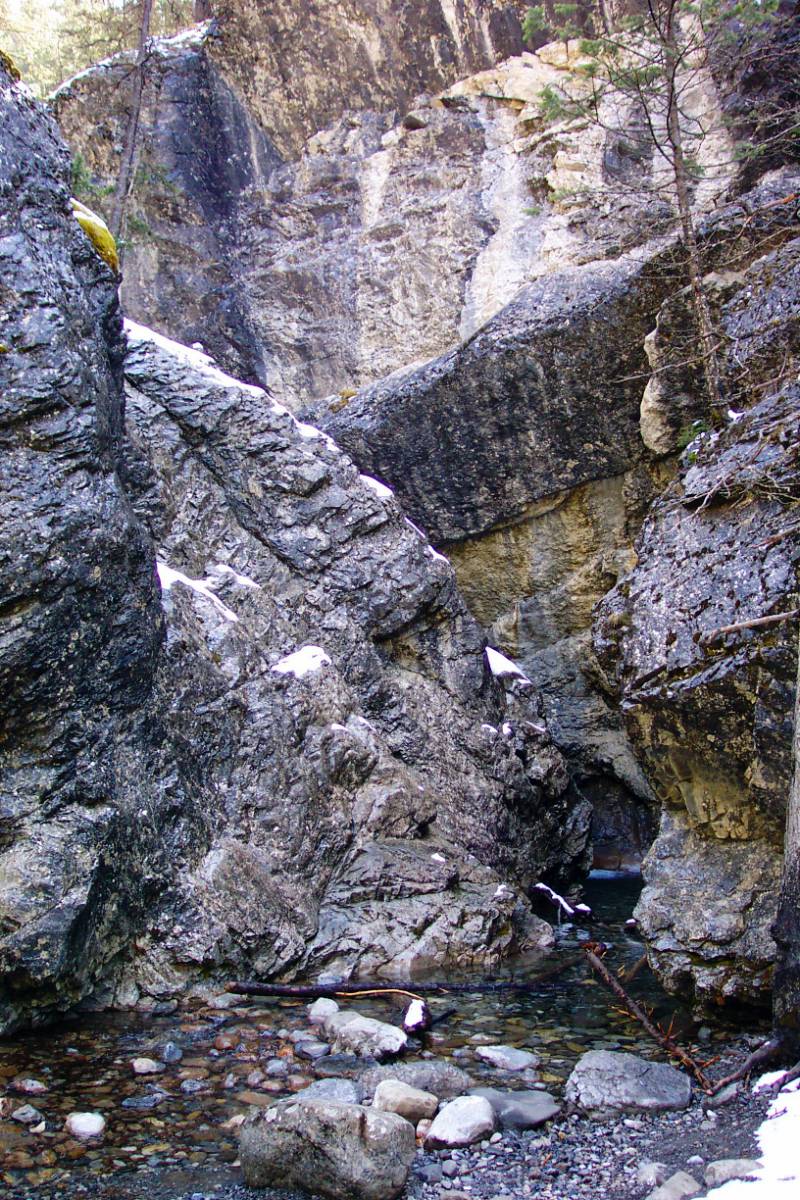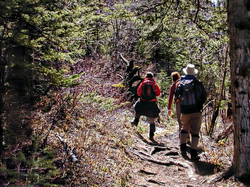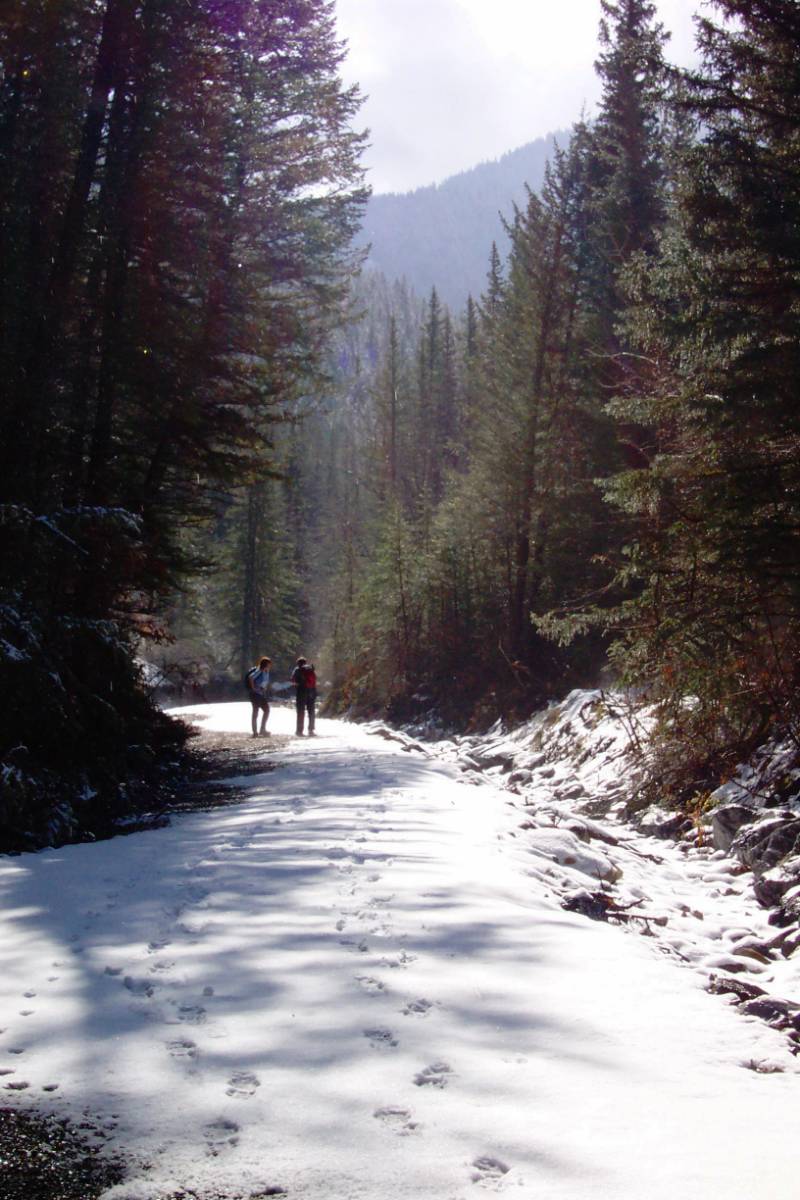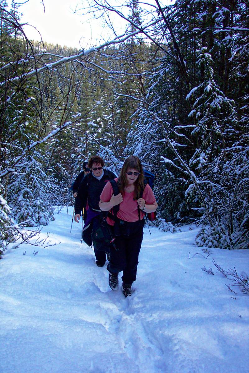 This was a great little hike and one that we highly recommend to someone looking for an easier hike, or a good "first hike of the season". The hike from the Heart Mountain trailhead to the junction where Quaite Valley trail meets Prairie View and Jewell Pass is about 12km round trip. If you want more, you can go up and back on Prairie View, or on Jewell Pass, or head back and do Heart Creek as an addition. The trail itself starts at Heart Mountain and heads west on the Quaite Creek montain bike trail, which is a continuation of the trail that comes from the Heart Creek Day Use parking lot. The trailhead is just a few feet before the yellow "scramble warning" sign for the Heart Mountain trailhead. Follow the Quaite Creek Trail to the junction where this trail ends. Here you will find a very wide, gravel trail which will take you 1.6km east to the Quaite Valley Backcountry Campground. Beyond the campground, the trail once again becomes a proper trail which takes you to the junction for Jewell Pass and Prairie View. This would also make a great beginner mountain bike route. Anyway, we had a really fabulous day, despite some disappointment when we first saw the wide gravel trail, but after the campground we found a lot of snow and iterated our thanks to Marty, Veronique and Jason for breaking trail for the rest of us wimps up to the trail junction. Because of the deep snow, we did not continue on Jewell Pass or Prairie View, but rather, stopped and had lunch and then headed back. Marty made the first COC snow-woman. Half of us did Heart Creek as an add-on, and some did the requisite Kilkenny add-on as well. -- Rhonda |