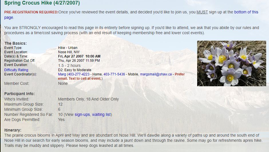 What a fantastic morning! A rough start for one who managed to lock her keys in the house - shhhhh, don't tell - but none the less she was able to catch up with us using her super-sprint powers. The sky cleared and we hiked in bright sunshine throughout the morning. Nose Hill is loaded with crocus blooms - wow! Most of us finished up the morning eating sushi - a new experience for some. Welcome to new member Sarah who has just moved to Calgary and is originally from New Zealand. Thank you to everyone who came out! - Marg