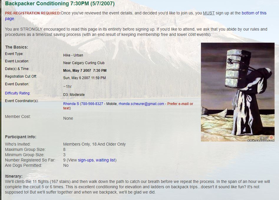 For the first time, I didn't carry my pack tonight. My thighs are too sore from Yamnuska yesterday! But, I made myself useful by taking photos anyway, and I did do the stairs 6 times with the gang. Then we had chocolate, which made it all better. -- Rhonda |