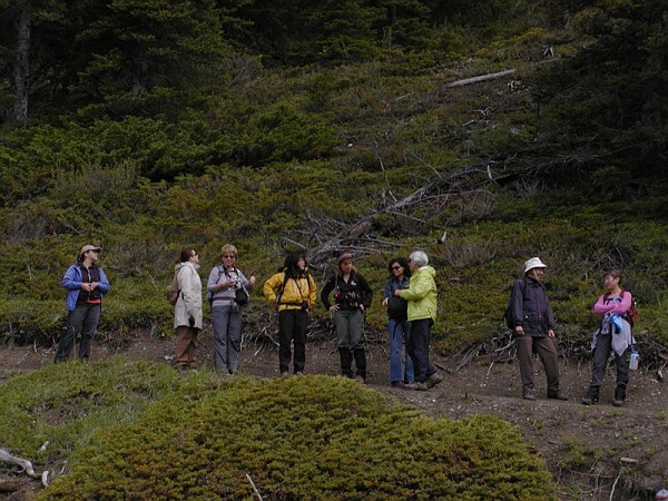 Herons: 1 Grizzlies: 1 Moose: 3 (including one repeat) Sheep: 2 Hawks: 3 Deer: 2 Coyotes: 1 Very Large Porcupines: 1 Raindrops: 0 In full defiance of the forecast of rain, we headed out today for our easy hike at Upper K-Lake and enjoyed a pretty full day of hiking, noodling and exploring with nary a raindrop to be found. We started at Interlakes and headed clockwise. Stopped for lunch at the boat launch and then hiked to the big falls at Sarrail creek. At that point, seven of us turned back and Marko, Ann, Lina and Lisa continued to do the circuit. Hopefully they were able to make it all the way around - we stopped at the info center on the way back and the gal there told us that Hidden Creek may be impassable due to high water at this time. My poor, poor Bridget bailed because she didn't want to hike in the rain and I can't wait to show her the photos and rub her nose in what she missed. -- Rhonda PS... Marty wanted me to mention that most of the wildlife sightings were from the car, not on the trail. Specifically the grizzly and mooses... |