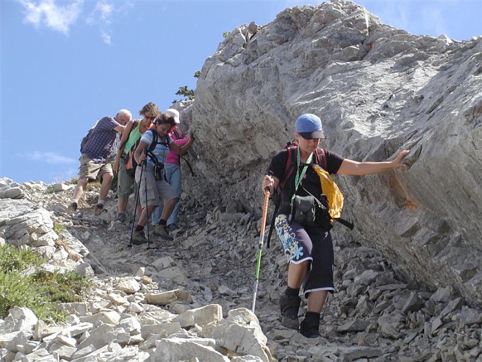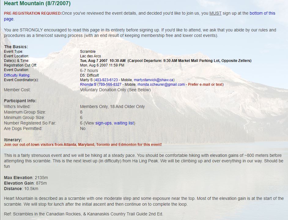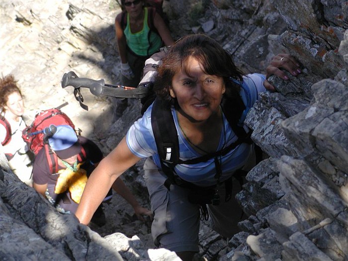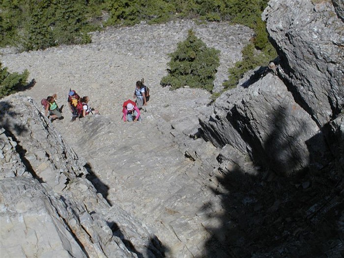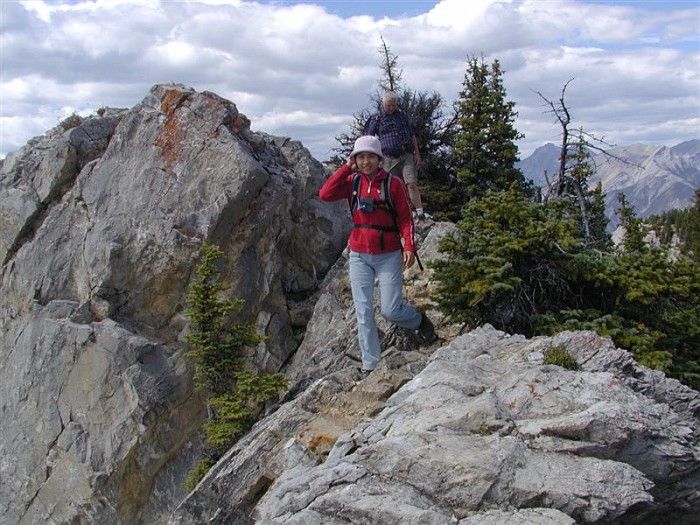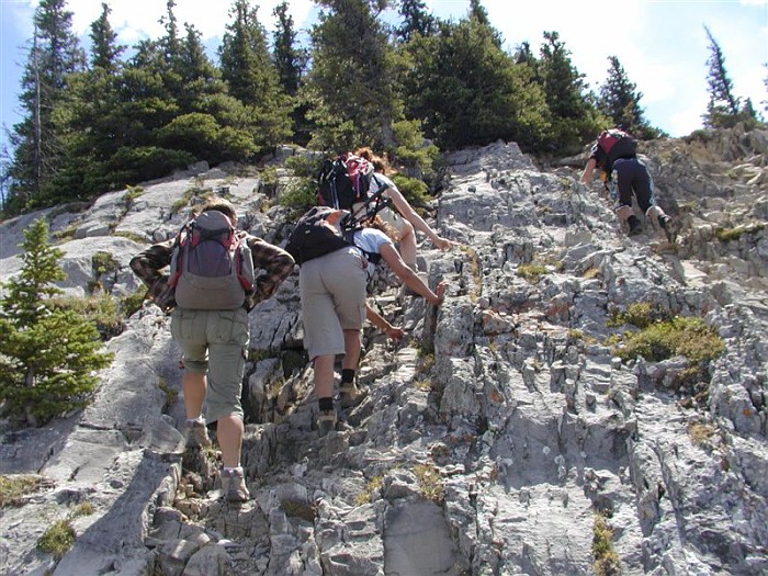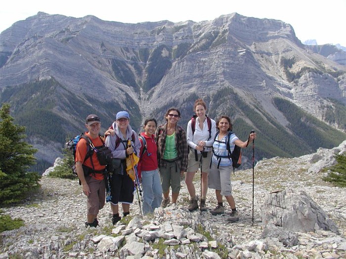 I got nothin'. After the sheer terror I experienced doing this scramble with snow (see April 14) on it, I'm proud to say I wasn't much scared today, just nervous in a couple of places. However, "enjoy" would be too strong of a word for how I felt about this trip... I can say that for most of the time it didn't completely suck. Am I proud that I conquered some fears over the last time? Nah, not really. I think I would be just as frightened in the snowy conditions from last time. Although, I was definitely less scared than I would have been a few years ago when my "comfort zone" was a little tighter. But, since I didn't really enjoy the activity, there's nothing to make me feel like "wow, it was really worth it to push my limits for this". To re-iterate one of the things I said on April 14th, I have met the requirement to try scrambling before writing it off as an activity. I gave it the required "second chance" because it wouldn't be so bad without the snow (this is very true). For now, at least, I am done with scrambling. The steep up isn't so bad in some places - almost kind of enjoyable. But I don't care for the "high up" views - I like the mid-level views with stuff above and below me (I know, I know, it's me against everyone else in the world) and I DEFINITELY don't care for the steep down, especially with all the loose rock that constantly tries to fling me onto body parts that aren't made to be in contact with the ground. Again, it sounds like the rest of the group had a lovely day, and the company today was fabulous - a really enjoyable group (except maybe for yours truly). It was great to have Hong from Toronto join us (she's truly one of us now... altitude shmaltitude), and Will The Stranger who has been meaning to join our club but just "hadn't gotten around to it yet" (we met him at the summit). Signing off from my scrambling career, -- Rhonda |
