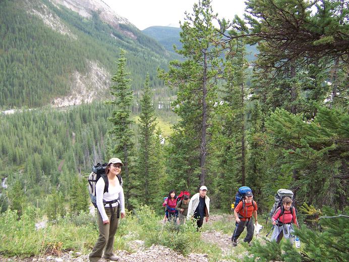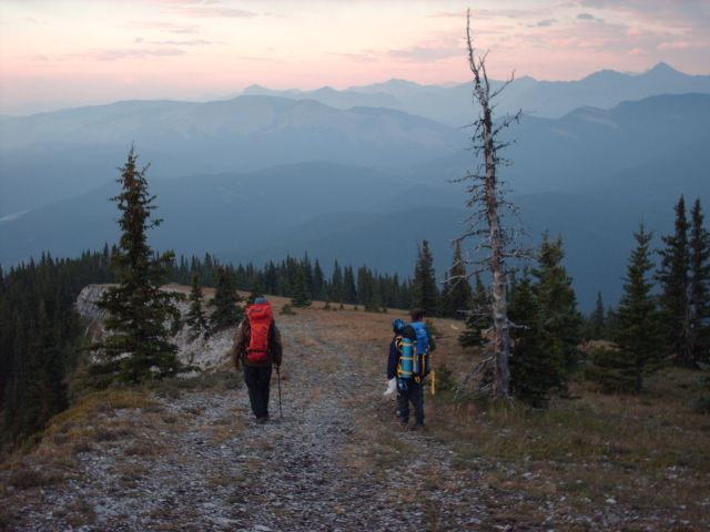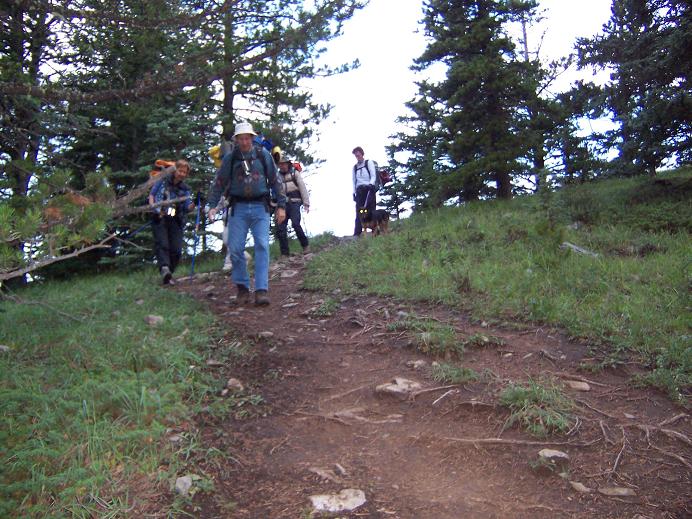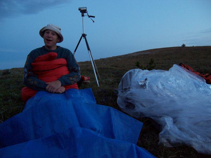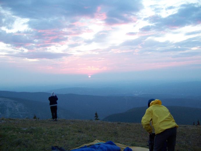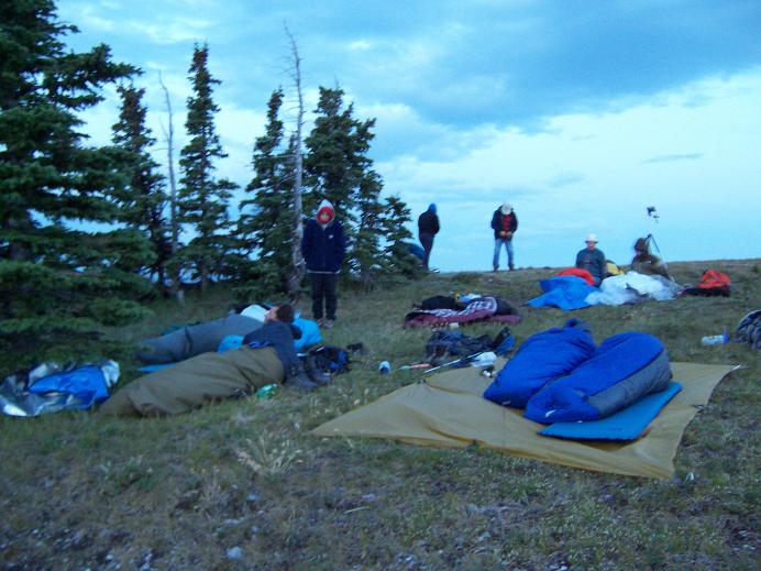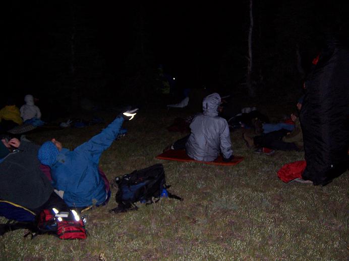 Finally, after a three-year wait we got to do this again! We did it the first time in 2004, and it was awesome, although most of us weren't quite prepared for how cold it would get up there. 2005 didn't work out because of clouds/rain and 2006 didn't work out because of a full moon. This time, it was pretty cloudy all day. The hourly forecast showed the sky clearing in Bragg Creek at around 7:00 or 8:00 and then getting cloudy again around 1AM. We decided to take our chances and believe the weatherman. It was cloudy as we hiked up, with just a few smidgens of blue sky showing. When we reached the top, it was pretty overcast and stayed that way 'til after 10:00 but then stars started popping up and that's when I became hopefully that we'd actually see the meteors. There were a million stars out by the time we spotted the first unmistakable meteor making it's brief, firey shot across the sky. Marty and a couple others said that there were a LOT of meteors (about 12 or so) in the half hour from 3:30 - 4:00. Funny, I didn't notice any during that time! It was chilly and somewhat windy staying up top, but most people took my warning seriously and were pretty prepared for that. I woke up in the morning to about half the group still there, and as there were no discernable weak cries for help as we hiked down, I'm assuming that all who relied on the glow sticks to find their way did just fine. We watched the beautiful red sunrise and then hiked down. Thanks to everyone for coming out - I hope you had a great time! -- Rhonda It was a blast! the hike up was fun and lots to see, as was the hike down! The meteors were fun especially when as one streaked across the sky leaving its cosmic skid mark on the sky, everyone would oooh and aww and even clap out loud! The weather was good, and I am surprised to say I was nice and toasty in my sleeping bag, a definite for any future hike of this kind, as those without usually left due to being cold. Was fun and met some really great people, some of whom went out for breakfast the next morning! Have tones of pics so if anyone wants them just let me know! Actually it would be great to know the names again of some of the people I even took photos of! Was my first COC event, and I must say it was great to finally get out into the Mountains again and meet a bunch of new people! Plus it was my first ever real sleepover under the stars, you know without the tent being there too! -- JenWile |