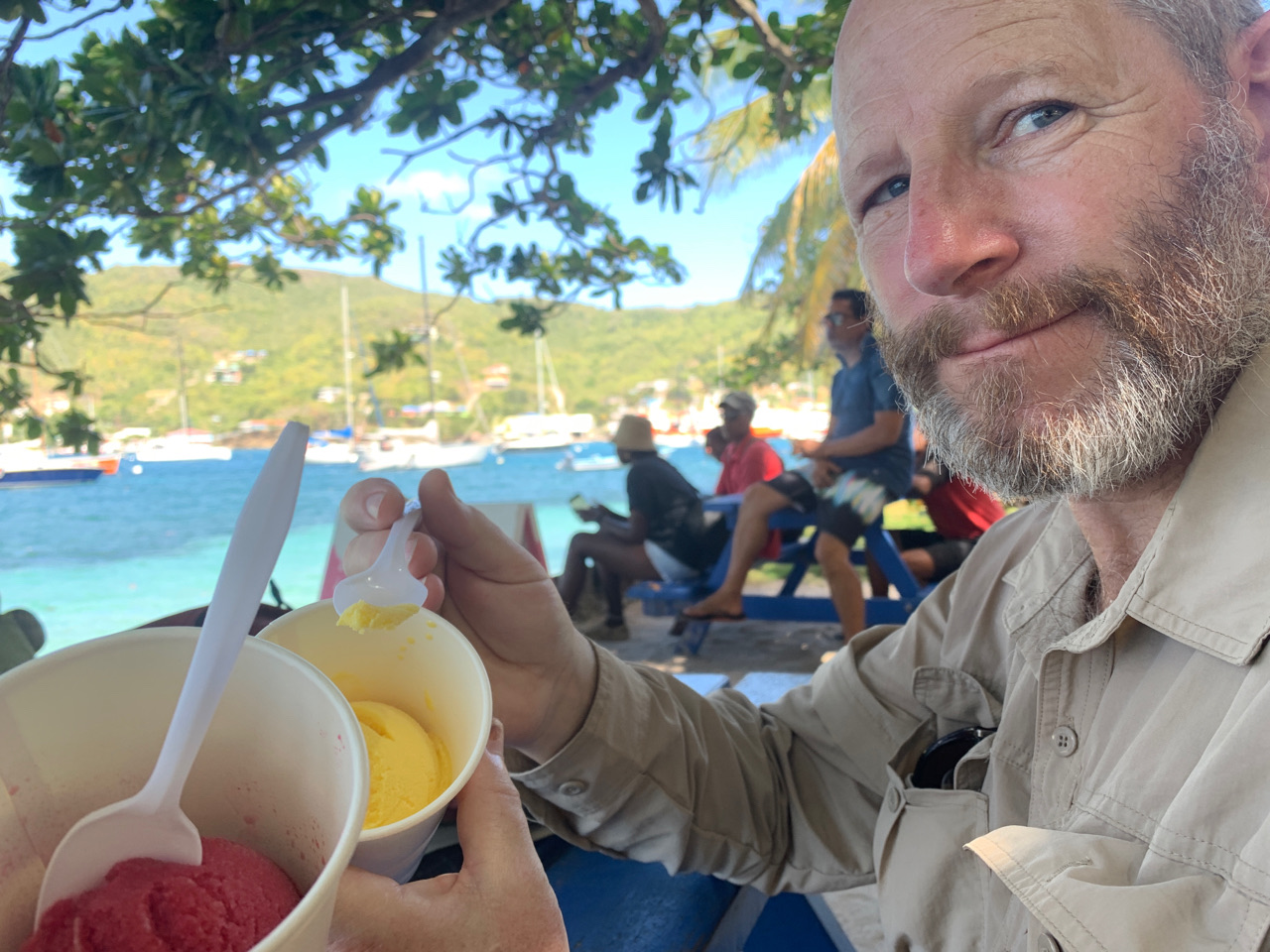 This morning we walked into Port Elizabeth and then took a taxi to the far south end of the island. It’s the ‘country’ where there’s nothing but plantations, farms, wind… and rich people. After the taxi dropped us, we walked back to Port Elizabeth, then to Lower Bay, stopping at Maranne’s for homemade ice cream (I had ginger sorbet and Brent had mango frozen yogurt), and then for a ‘cheapest beer on the beach’. |