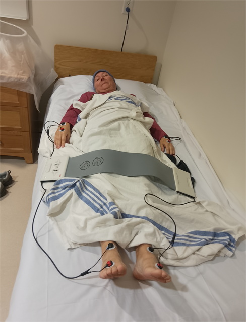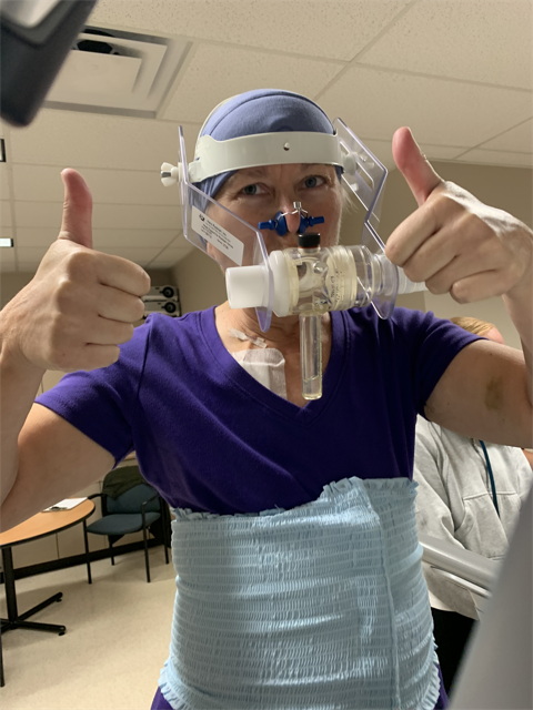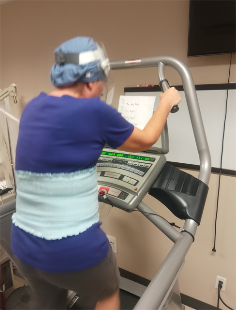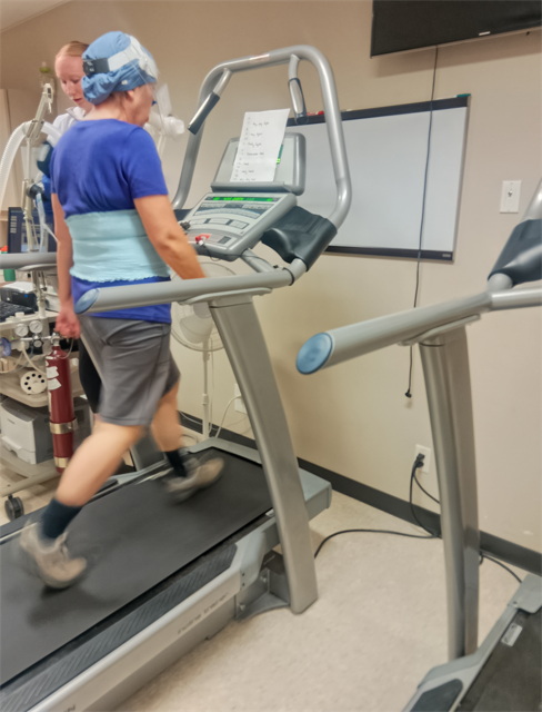 They ran a bunch of different tests on me, including a treadmill stress test. They had me walking 5 km/hour while they raised the incline by 1% every minute. As the incline got higher, they kept asking me if I wanted more. Every time they asked, my brain said no, but my stupid hands kept making a "bring it on" motion. Finally, when they got to 11%, and my heart rate was 171bpm, I bailed. They said my VO2 was 26. Brent and I had never heard of VO2 before, so I had to look it up. Google says "VO2 is the volume or amount of oxygen your body consumes. The fitter you are, the more oxygen your body burns and the higher the score. Peak VO2 is the measure of millilitres of oxygen consumed at maximal effort divided by a person's weight in kilos per minute." For a 57-year-old, the V02 range is 16.0 (5th percentile) to 35.9 (95th percentile), so I'm kinda average, but I'll take it. Tests: