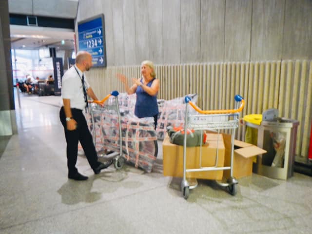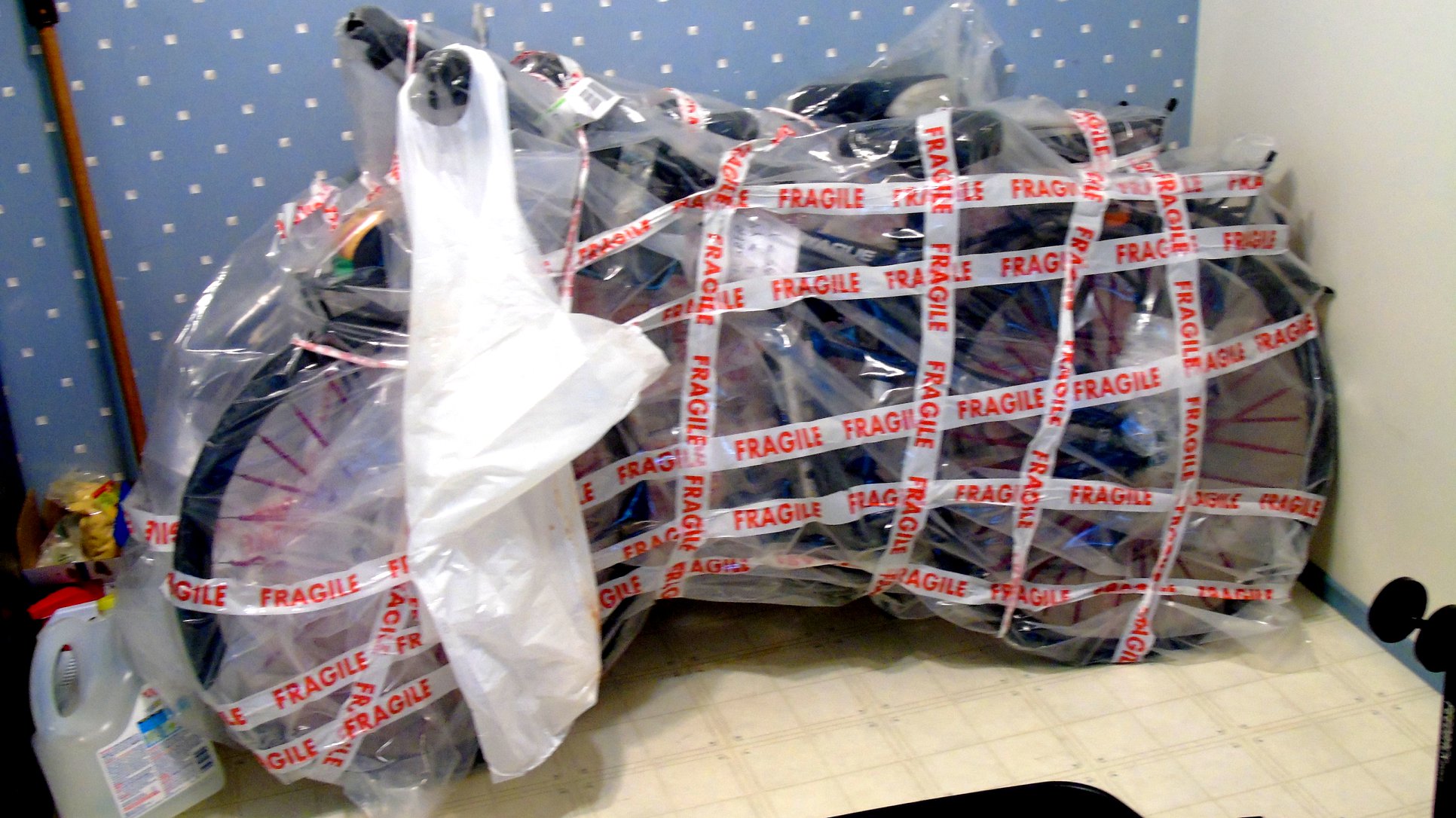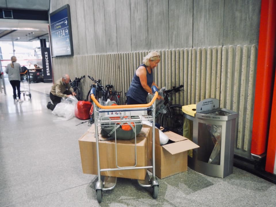 We had a very leisurely morning at the hotel today since our flight didn’t leave ‘til 2:20pm. At 10:00 we started moving out, starting with bringing the three bikes down to the lobby. We took the bikes over to Terminal 1 and left them there with Ann to guard. Brent and I went back to the hotel and used a cart to bring their stuff boxes and my stuff... bundle to the terminal. We then commenced with preparing the bikes to go into the bags, turning the handlebars, adding some bubble wrap around the dérailleurs, etc. A WestJet agent approached us right away and insisted that we had to have boxes for the bikes. We insisted that their web site says bags are ok. He left to find a supervisor. We kept preparing the bikes. He returned and said the supervisor confirmed that we had to have boxes. Again I countered that the web site states otherwise but he was insistent and told us we had to get boxes from Air France upstairs. Brent went to look for Air France, but it turned out they’re actually in a different terminal. Then the supervisor showed up and confirmed that the bags were fine. WHEW! Crisis averted! We finished prepping the bikes and put them into the bags, and on our way we went. All we can do now is hope that the bikes arrive safely in Edmonton. Geoff has his bike in a box and Tristan, the French traveler on his way to Calgary to cycle the Great Divide Trail has his in a self-constructed styrofoam, bubble-wrap and tape construct. We’ll see on the far end how everyone made out. |