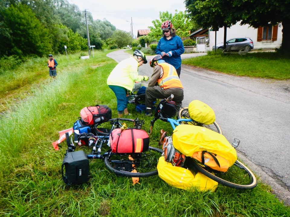 | Other than one flat tire, a pleasant, uneventful ride to Sancerre today. Lynn wanted to go up the hill to see the old town of Sancerre so we rode only 36km and set up camp. Laura and I stayed behind while the others went up the hill. |