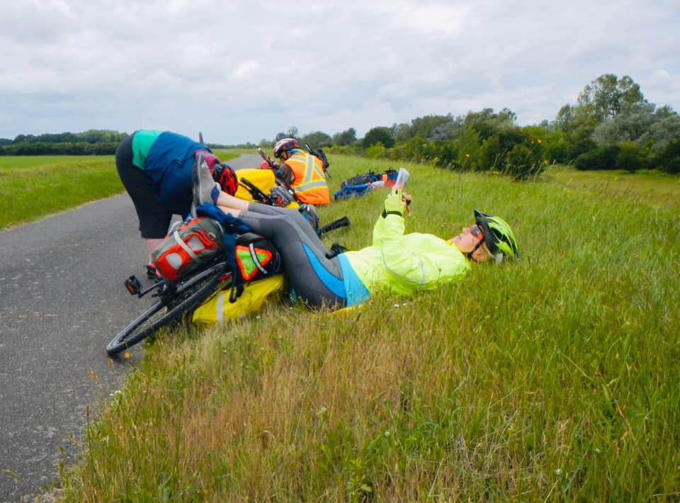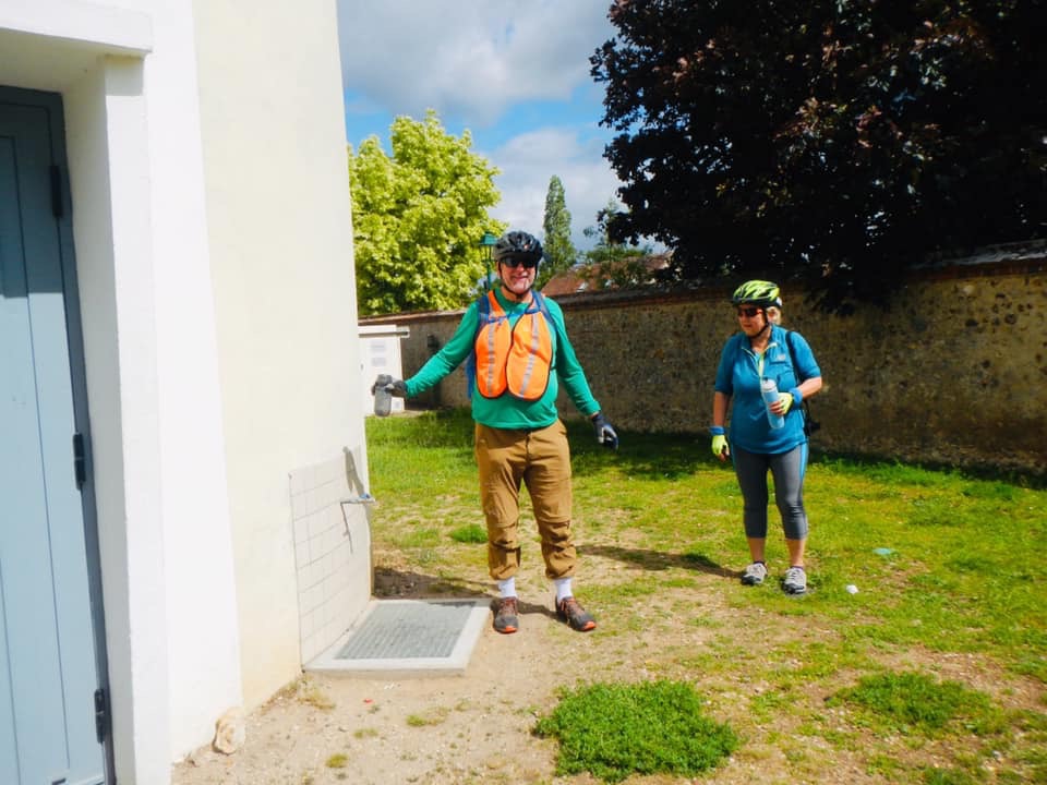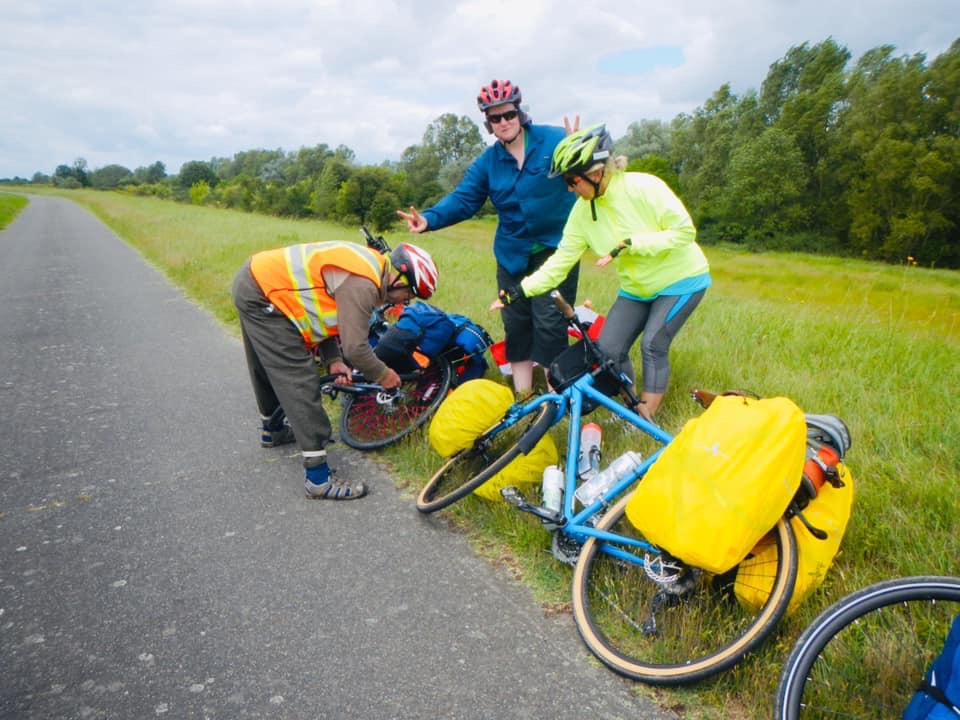 Today was my turn to have the flat tire. No idea what caused it. Brent changed it and didn’t find a hole or a cause but it was definitely leaking. We found a store in Sully that sells patch kits and tubes (and yes we bought some) but no racks and no repair (for Brent’s broken rack, which, so far, is holding up nicely with the McGyver fix). The repair shop looked to be permanently closed.