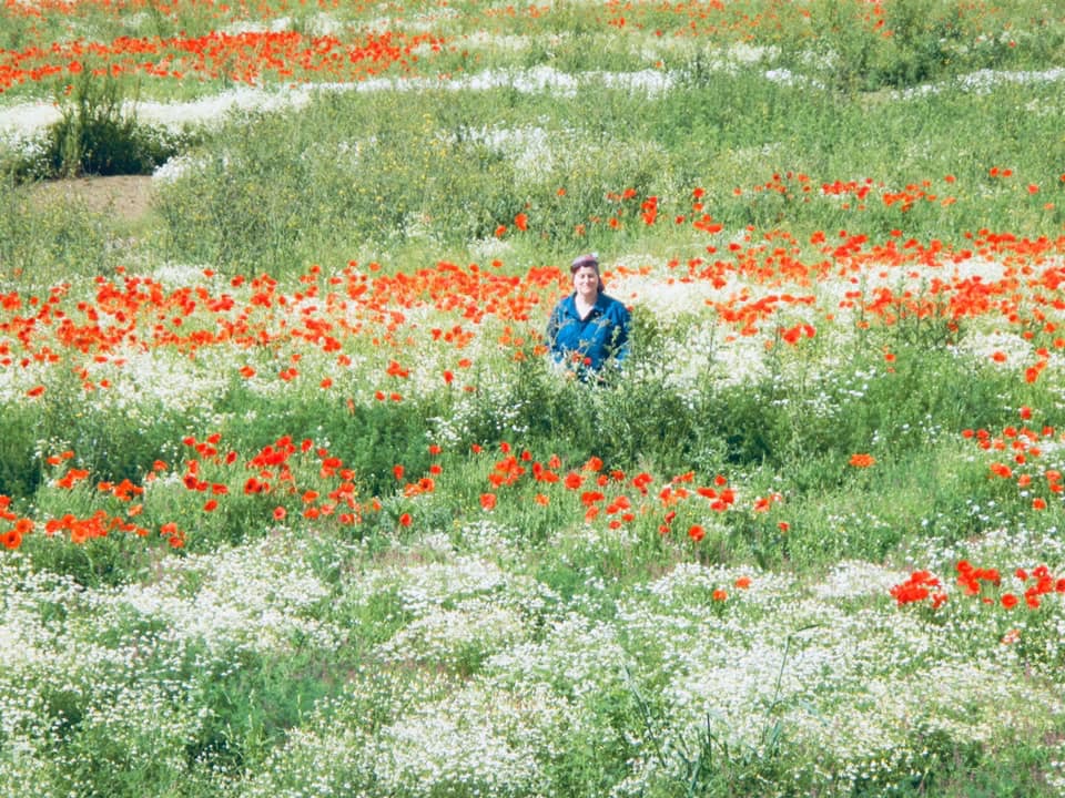 Playing in a poppy field