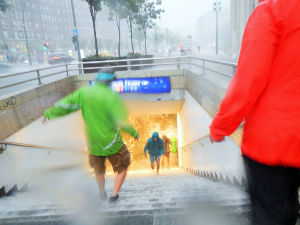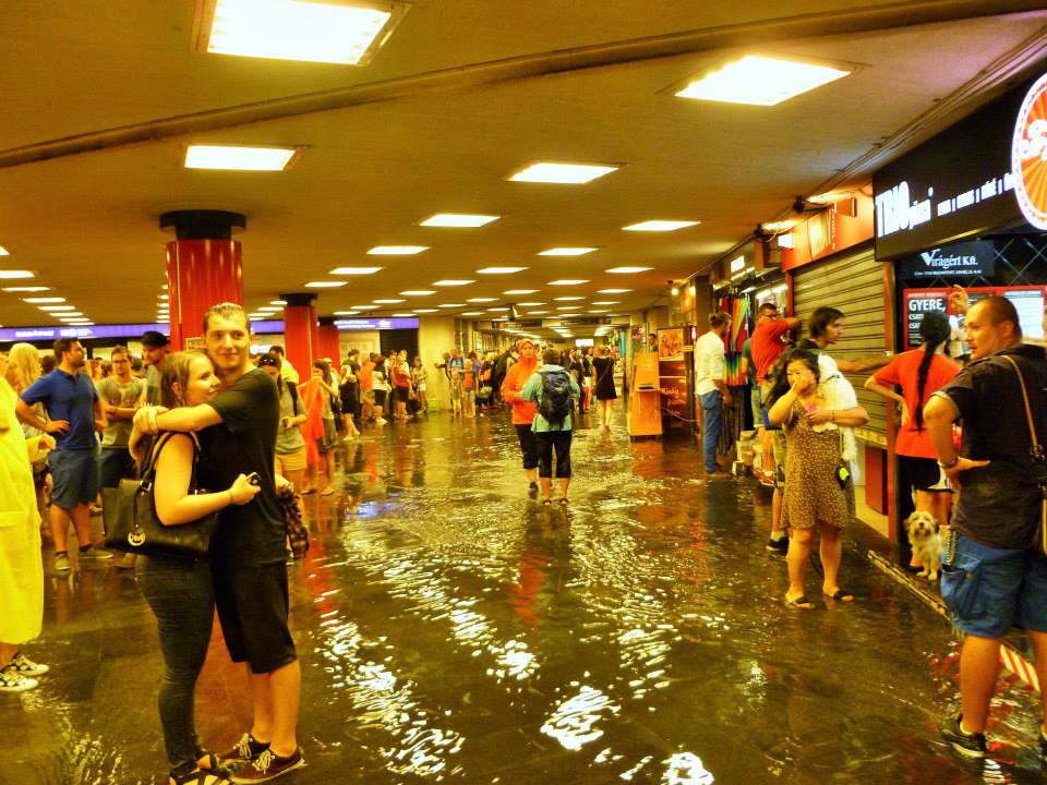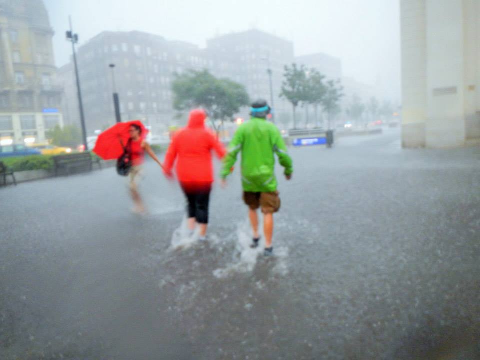 | After our Bites and Sights tour ended, we walked across the street to an English Bookstore. While we were in the store, a torrential downpour started. The bookstore was closing, but they decided to take pity on us, and a couple of other shoppers and let us wait it out for a while. When it didn't let up, Brent, Laura and I decided to make a run for it. Michelle stayed hoping to wait it out longer. The streets were running with water. Young Hungarians filmed us walking down the street from their dry balcony. The stairs down into the Metro were a cascading waterfall. The first floor of the Metro station was a lake, with people huddled all over. The Metro was running - yay! When we got to our stop, it was raining more lightly and there was some water running down the stairs but it wasn't a river (yet). We waded to the hostel. I checked to see if there had been a cancellation for tomorrow night so Brent and I can stay at the hostel and wait this out, and luckily, there was a cancellation so we'll be staying here another day. Thank goodness we don't have to be on a train or a bike trail tomorrow! |